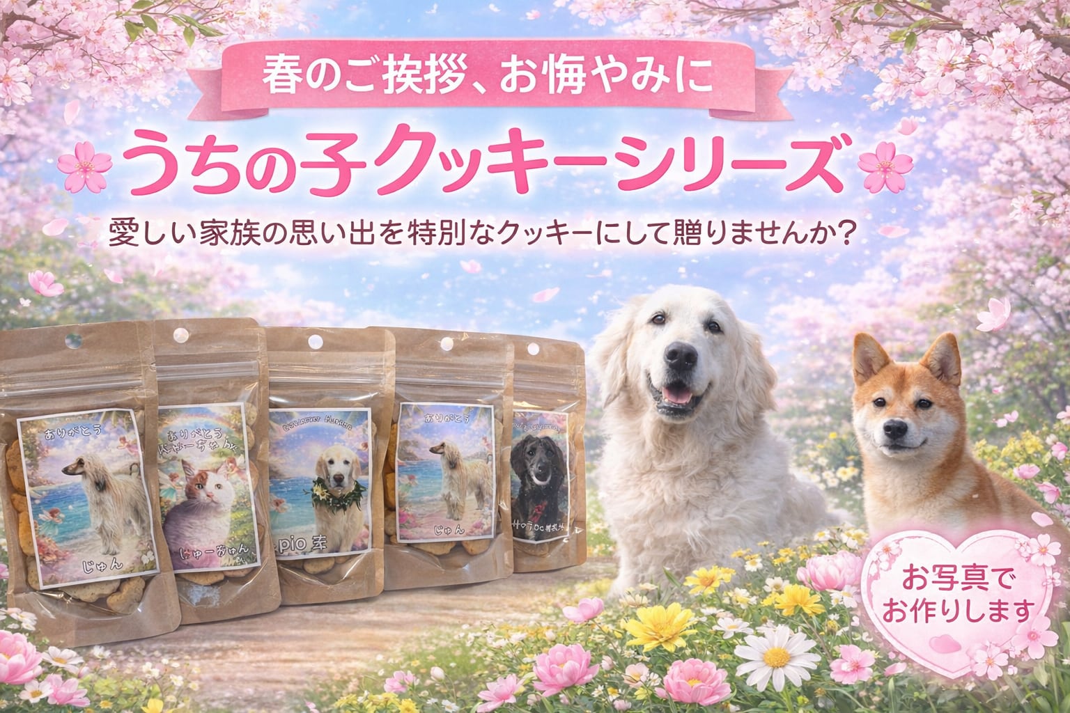 【オープン記念価格のお知らせ】 こちらのページはオープン記念として、3月25日まで税込4,950円にてご注文をお受けいたします。 それ以降は価格改定を予定 春限定 うちの子オリジナル「お花見クッキー」 春のやさしい桜背景に、 大好きな“うちの子”のお写真をお入れするオリジナルクッキーをお作りします。 お悔やみではなく、 お花見記念 春のお出かけ記念 バースデーやギフト 「うちの子が世界一♡」記念 春らしい華やかな背景で、特別なクッキーをお届けします。 商品内容 ・1袋50g入り ・無添加・自家製クッキー ・1袋 550円(税込) 今月いっぱいのサービス価格です ※9個よりご注文承ります。 デザインについて ・お客様のワンちゃんのお写真をお入れします ・文字・メッセージ自由 ・文字カラーもご指定可能 ・9袋すべて違う言葉でもOK (合計9パターンまで対応可能) 「お花見に行ってきました」 「うちの子記念日」 「Happy Spring」 など、お好きな言葉をお入れできます。 ご注文方法 ご希望のお写真を数枚お送りください。 仕上がりイメージをご確認いただいてから制作いたします。 世界にひとつだけの、 春のうちの子クッキーをぜひどうぞ #春限定クッキー #うちの子オーダー #オリジナルクッキー #無添加クッキー #犬のいる暮らし #お花見記念 #ラリーズカンパニー #LarrysCompanあしております。 大切なあの子へ ― オリジナルお悔やみクッキーラベル 天国へ旅立ってしまった、かけがえのないご家族へ。 お写真をお預かりし、世界にひとつだけのオリジナルラベルをお作りいたします。 たくさんのお供えをいただいた際の「ありがとう」のお返しとしても、心を込めてご利用いただいております。 9袋セット、又は倍数でのご用意です。 お写真は数枚お送りください。 お問い合わせページよりお送りいただけます。 ラベルは1種類でなくても大丈夫です。 ご希望のお写真を、ご希望の枚数で、合計9枚又は倍数になるようにお作りできます。 出来上がりイメージをご確認いただいてから、クッキーのラベルに仕上げます。 お名前やメッセージなど、入れたい文言もお入れいたします。 心を込めて焼き上げた、無添加クッキー 中に入るクッキーは5種類。 素材にこだわり、添加物を一切使用せず焼き上げた ラリーズカンパニー自家製・無添加クッキーです。 ・保存料 不使用 ・着色料 不使用 ・香料 不使用 ・マーガリン 不使用 ・ショートニング 不使用 奥浜名湖の湖畔にある小さなクッキー工房で、 一枚一枚、丁寧に手作りしています。 やさしい素材だけで作った、体にも心にも安心なおやつです。 商品詳細 ■ 内容量 約50g(手作りのため多少前後いたします) ■ パッケージ チャック付きスタンド袋 お供えとしてそのまま立てて飾っていただけます。 大好きだったあの子へ。 そして、今も変わらず想い続けるご家族へ。 心を込めてお作りいたします。