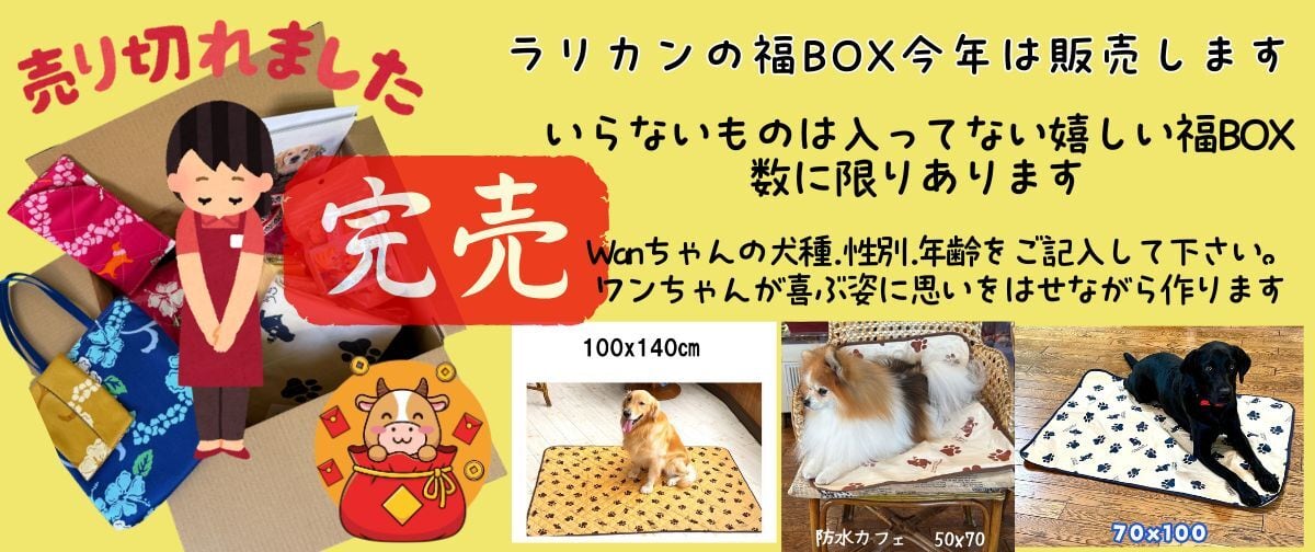 福袋に入りきれないので、福BOX。 ワンちゃんの犬種、男の子か女の子か、年齢などご記入下さい。 【決まって入っているもの】 マルチカバー 100x140cmx1 防水ラリシー カフェサイズ 70x50cmx1 防水ラリシー ミニ100x70cm 浜名湖 大吉おみ クッキーx1 (柄はお任せになります) ~~~~わんちゃんに思いをはせながら入れるもの~~~ ハンドメイドグッズ 少々 ワンちゃんに合わせたグッズ 少々 ~~~~~~~~~~~ 縁起の良いラリーズカンパニーの福BOX 数量限定で販売します。 #犬の福袋 #愛犬用福袋 #ラリカンの福BOX #浜名湖ドッグ #浜名湖首輪