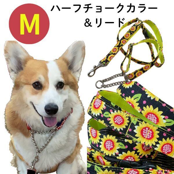 ハーフチョークカラーとリードのセット 送料無料★Mサイズ ひまわり柄 中型犬用