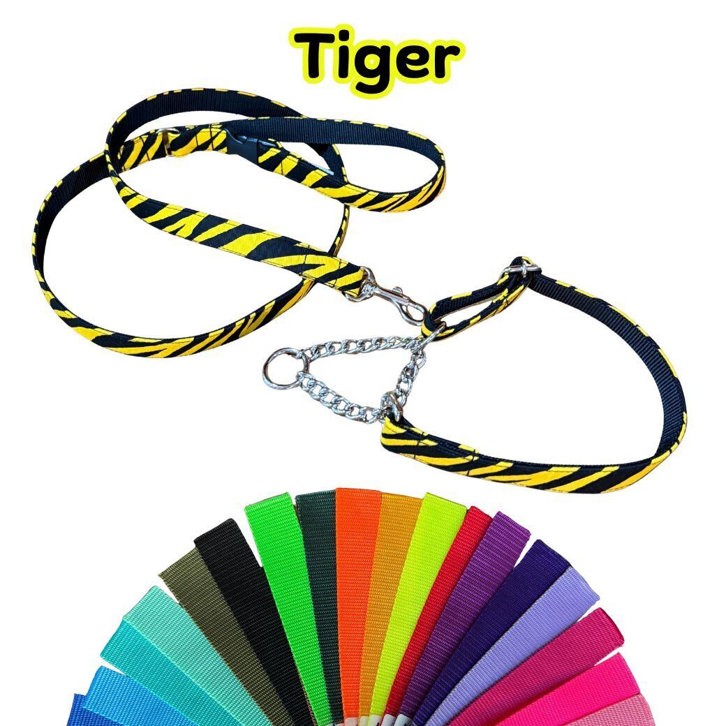 大型犬用 Lハーフチョークカラーとリード 料無料★トラ柄 大型犬用首輪とリードのセット Lサイズ 裏テープはお好みの色で ハーフチョークカラー 日本製 オーダーメイド|ラリーズカンパニー